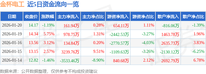 证券之星消息,截至2026年1月20日收盘,金杯电工(002533)报收于14.17元,下跌1.19%,换手率6.5%,成交量41.42万手,成交额5.87亿元。