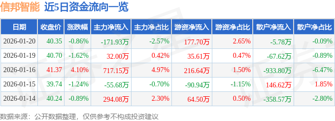 证券之星消息,截至2026年1月20日收盘,信邦智能(301112)报收于40.35元,下跌0.86%,换手率1.51%,成交量1.66万手,成交额6696.65万元。