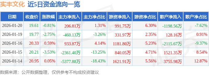 证券之星消息,截至2026年1月20日收盘,实丰文化(002862)报收于19.61元,下跌0.81%,换手率6.28%,成交量7.92万手,成交额1.57亿元。
