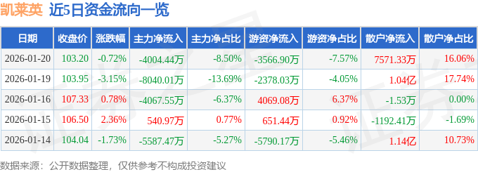 证券之星消息,截至2026年1月20日收盘,凯莱英(002821)报收于103.2元,下跌0.72%,换手率1.45%,成交量4.6万手,成交额4.71亿元。