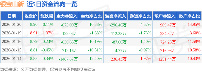 证券之星消息,截至2026年1月20日收盘,银宝山新(002786)报收于8.9元,下跌0.11%,换手率1.47%,成交量7.28万手,成交额6483.25万元。