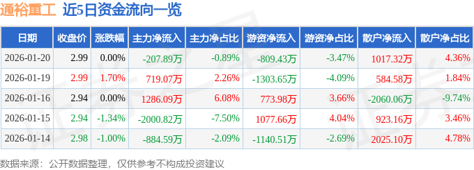 证券之星消息,截至2026年1月20日收盘,通裕重工(300185)报收于2.99元,上涨0.0%,换手率2.1%,成交量77.99万手,成交额2.33亿元。