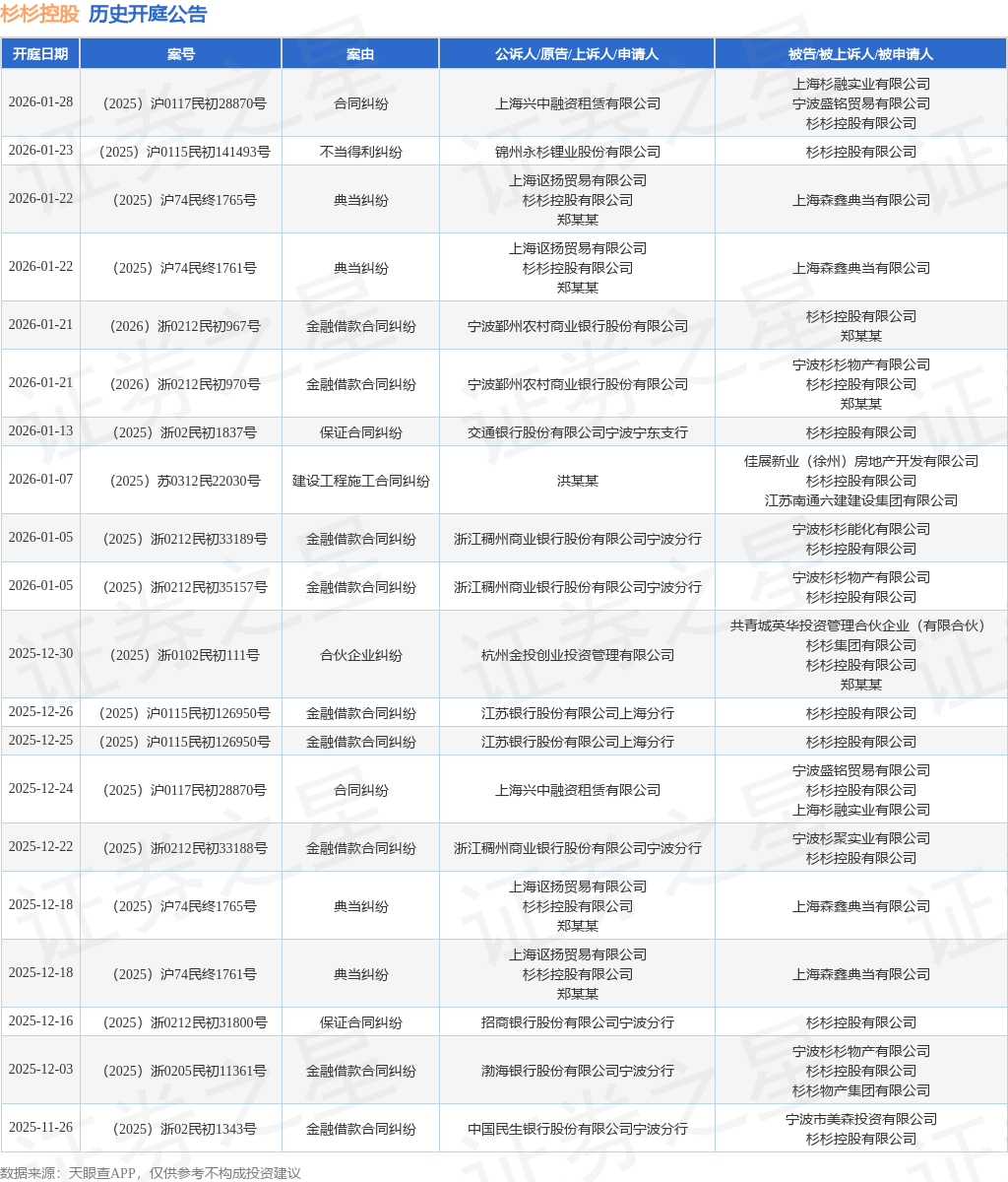 案号:(2025)沪0115民初141493号根据统计,近一年内以杉杉控股有限公司为当事人的历史开庭公告有107则,其中案由为“金融借款合同纠纷”的公告以40则居首,其次为“典当纠纷”有18则,“保证合同纠纷”有8则。历史开庭公告(前20条)如下: