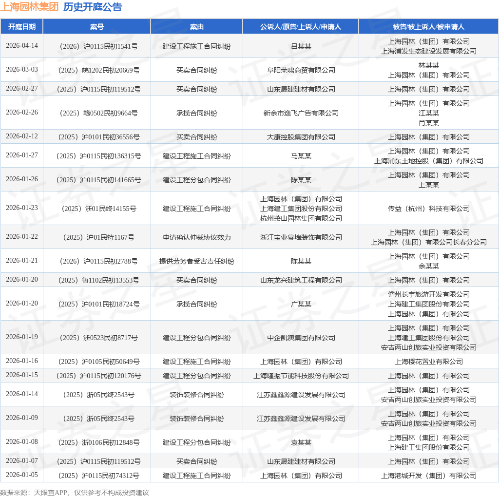 案号:(2025)浙01民终14155号根据统计,近一年内以上海园林(集团)有限公司为当事人的历史开庭公告有91则,其中案由为“买卖合同纠纷”的公告以23则居首,其次为“建设工程施工合同纠纷”有22则,“建设工程分包合同纠纷”有10则。历史开庭公告(前20条)如下: