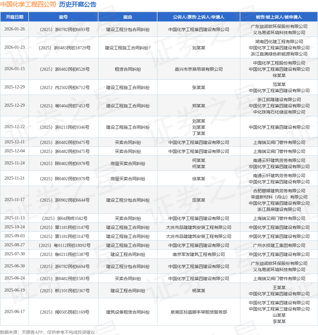 案号:(2025)浙0483民初18729号根据统计,近一年内以中国化学工程第四建设有限公司为当事人的历史开庭公告有50则,其中案由为“建设工程施工合同纠纷”的公告以21则居首,其次为“建设工程分包合同纠纷”有7则,“买卖合同纠纷”有5则。历史开庭公告(前20条)如下: