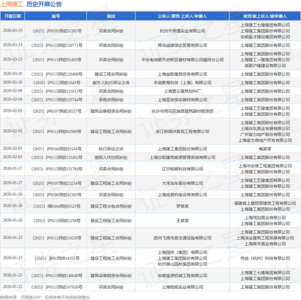 案号:(2025)沪0115民初146648号根据统计,近一年内以上海建工集团股份有限公司为当事人的历史开庭公告有469则,其中案由为“买卖合同纠纷”的公告以129则居首,其次为“建设工程施工合同纠纷”有85则,“案外人执行异议之诉”有50则。历史开庭公告(前20条)如下: