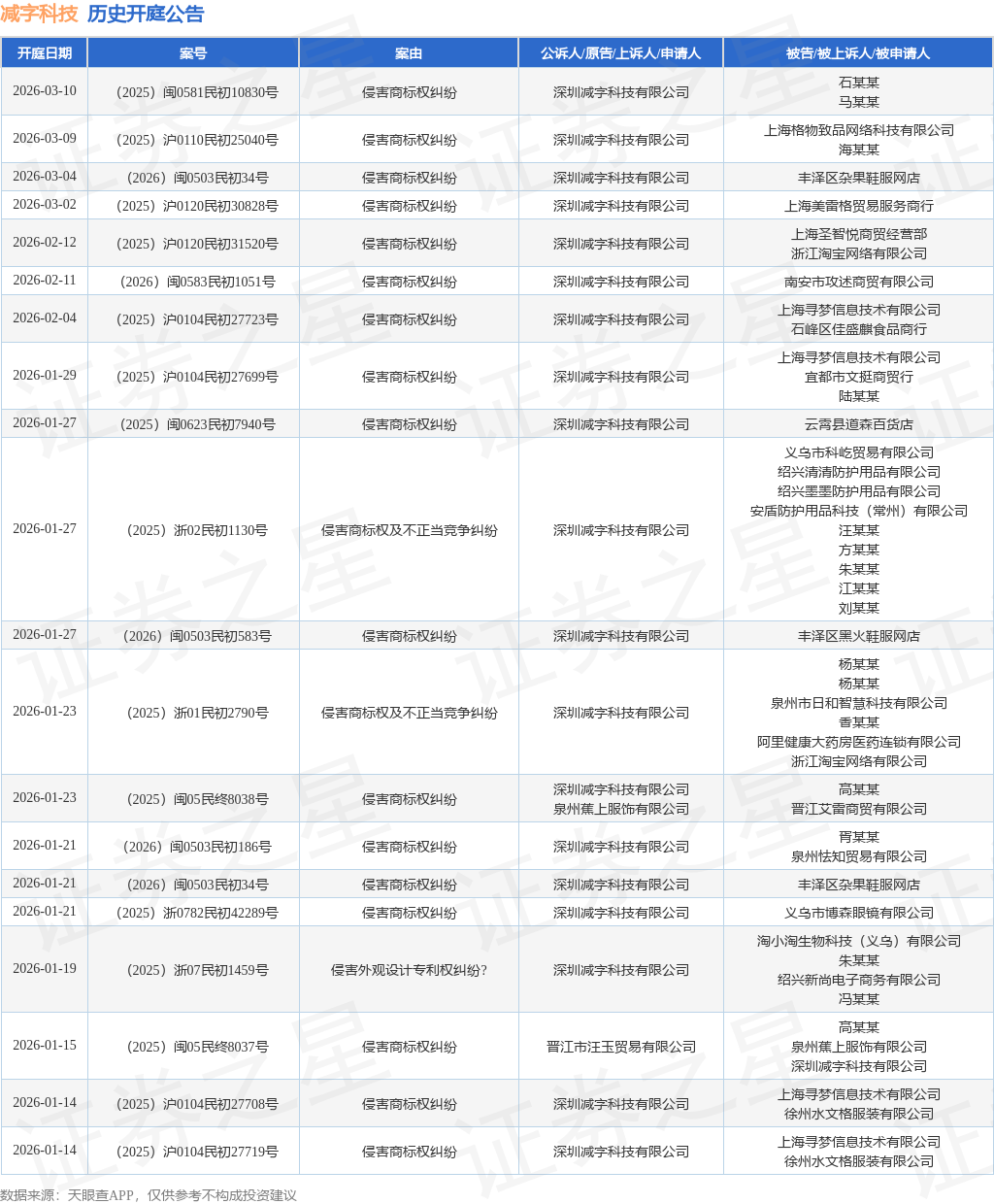 案号:(2025)浙01民初2790号根据统计,近一年内以深圳减字科技有限公司为当事人的历史开庭公告有292则,其中案由为“侵害商标权纠纷”的公告以227则居首,其次为“侵害商标权及不正当竞争纠纷”有29则,“不正当竞争纠纷”有7则。历史开庭公告(前20条)如下: