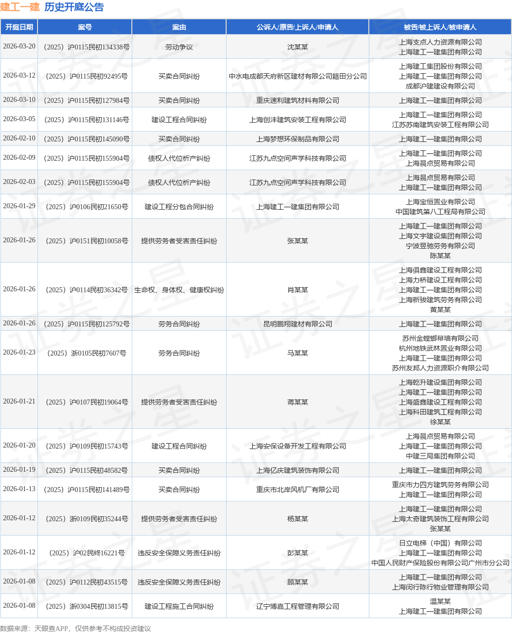案号:(2025)浙0105民初7607号根据统计,近一年内以上海建工一建集团有限公司为当事人的历史开庭公告有282则,其中案由为“买卖合同纠纷”的公告以81则居首,其次为“建设工程施工合同纠纷”有36则,“建设工程分包合同纠纷”有29则。历史开庭公告(前20条)如下:
