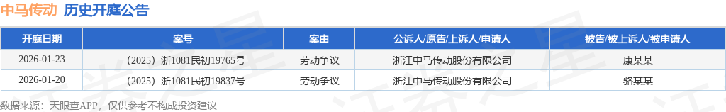 根据统计,近一年内以浙江中马传动股份有限公司为当事人的历史开庭公告有2则,其中案由为“劳动争议”的公告以2则居首。历史开庭公告如下: