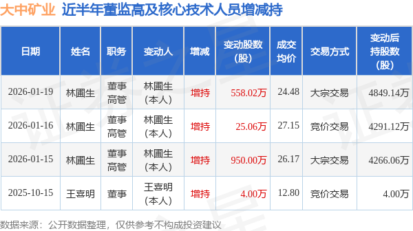 大中矿业近半年内的董监高及核心技术人员增减持详情如下: