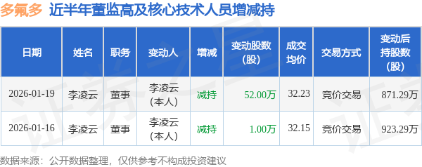 证券之星消息,根据1月20日市场公开信息、上市公司公告及交易所披露数据整理,多氟多(002407)最新董监高及相关人员股份变动情况:2026年1月19日公司董事李凌云共减持公司股份52.0万股,占公司总股本为0.0437%。变动期间公司股价上涨0.69%,1月19日当日收盘报32.2元。