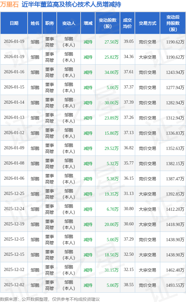 万里石近半年内的董监高及核心技术人员增减持详情如下: