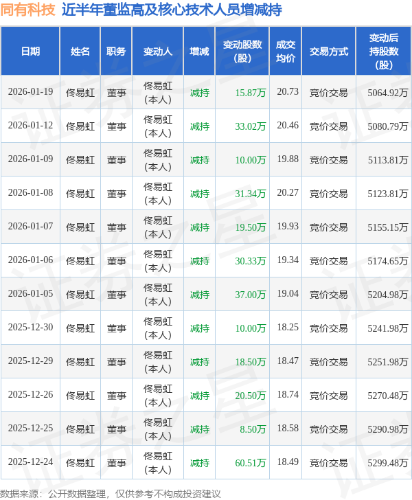 同有科技近半年内的董监高及核心技术人员增减持详情如下: