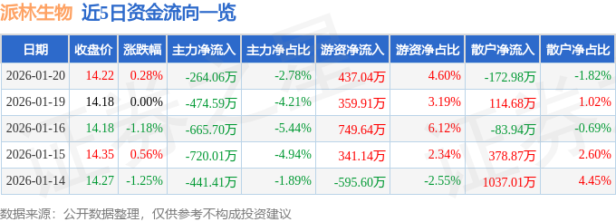 证券之星消息,截至2026年1月20日收盘,派林生物(000403)报收于14.22元,上涨0.28%,换手率0.71%,成交量6.7万手,成交额9502.4万元。