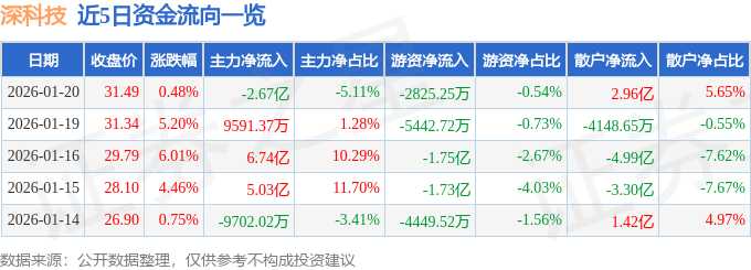 1月20日的资金流向数据方面,主力资金净流出2.67亿元,占总成交额5.11%,游资资金净流出2825.25万元,占总成交额0.54%,散户资金净流入2.96亿元,占总成交额5.65%。