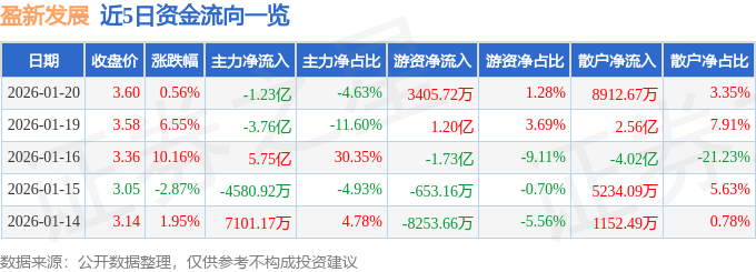 证券之星消息,截至2026年1月20日收盘,盈新发展(000620)报收于3.6元,上涨0.56%,换手率15.7%,成交量733.26万手,成交额26.62亿元。