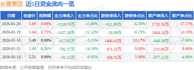 证券之星消息,截至2026年1月20日收盘,长青集团(002616)报收于5.69元,上涨0.89%,换手率3.02%,成交量17.76万手,成交额1.01亿元。
