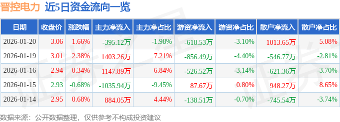 证券之星消息,截至2026年1月20日收盘,晋控电力(000767)报收于3.06元,上涨1.66%,换手率2.26%,成交量65.88万手,成交额2.0亿元。