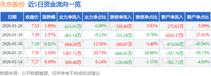 证券之星消息,截至2026年1月20日收盘,永东股份(002753)报收于7.53元,上涨1.89%,换手率4.91%,成交量11.91万手,成交额8912.2万元。