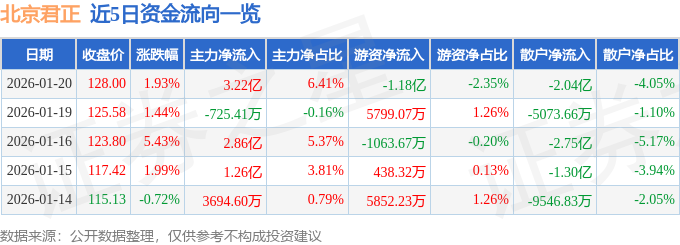 证券之星消息,截至2026年1月20日收盘,北京君正(300223)报收于128.0元,上涨1.93%,换手率9.23%,成交量38.84万手,成交额50.33亿元。