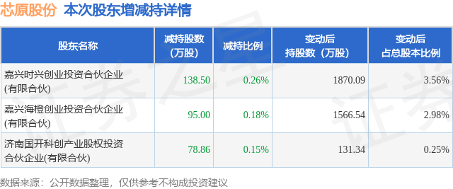 证券之星消息,1月20日芯原股份发布公告《芯原股份:股东减持股份结果公告》,其股东嘉兴时兴创业投资合伙企业(有限合伙)、济南国开科创产业股权投资合伙企业(有限合伙)、嘉兴海橙创业投资合伙企业(有限合伙)于2025年12月23日至2026年1月16日间合计减持312.36万股,占公司目前总股本的0.5941%,变动期间该股股价上涨38.09%,截止1月16日收盘报178.0元。