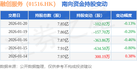 证券之星消息,1月20日南向资金减持102.02万股融创服务(01516.HK)。近5个交易日中,获南向资金减持的有4天,累计净减持957.89万股。近20个交易日中,获南向资金增持的有10天,累计净增持37.35万股。截至目前,南向资金持有融创服务(01516.HK)7.85亿股,占公司已发行普通股的25.66%。
