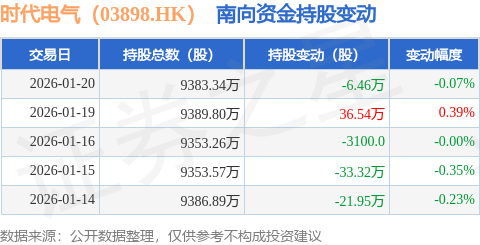 证券之星消息,1月20日南向资金减持6.46万股时代电气(03898.HK)。近5个交易日中,获南向资金减持的有4天,累计净减持25.5万股。近20个交易日中,获南向资金增持的有14天,累计净增持459.69万股。截至目前,南向资金持有时代电气(03898.HK)9383.34万股,占公司已发行普通股的19.18%。