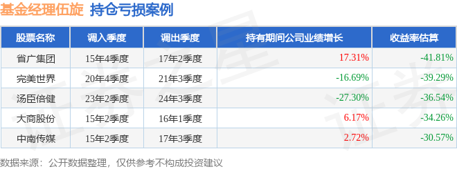 伍旋管理的鹏华改革红利股票基金在15年4季度买入省广集团,在持有1年又2个季度后在17年2季度卖出。持有期间的估算收益率为-41.81%,持有期间省广集团在2015年到2017年的年报营业总收入增幅达17.31%。