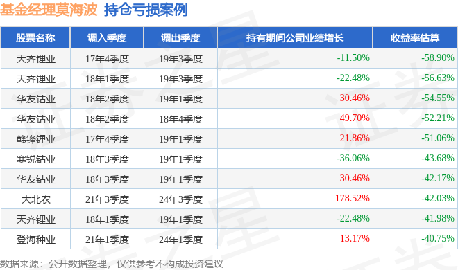 莫海波管理的万家品质生活混合A基金在17年4季度买入天齐锂业,在持有1年又3个季度后在19年3季度卖出。持有期间的估算收益率为-58.9%,持有期间天齐锂业在2017年到2019年的年报营业总收入降幅为11.5%。