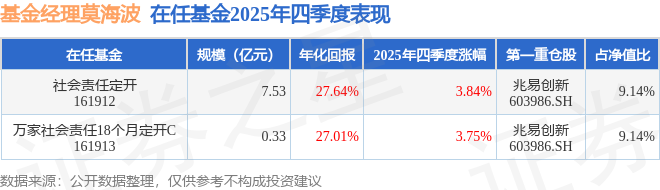 证券之星消息,截止2025年四季度末,基金经理莫海波旗下共管理2只基金,本季度表现最佳的为社会责任定开(161912),季度净值涨3.84%。