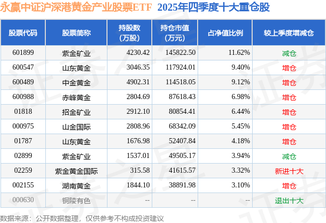 永赢中证沪深港黄金产业股票ETF基金成立于2023年10月24日,基金经理为刘庭宇,基金跟踪标的为中证沪深港黄金产业股票指数,成立以来超额回报为2.88%,近一个月超额回报为0.1%。最新披露的基金持仓数据显示,截止2025年12月31日,该基金第一大重仓股为紫金矿业(601899),持股占比为11.62%。