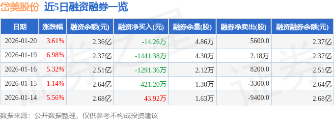 岱美股份融资融券信息显示,融资方面,当日融资买入3742.15万元,融资偿还3756.4万元,融资净偿还14.26万元。融券方面,融券卖出1.69万股,融券偿还1.13万股,融券余量4.86万股,融券余额50.12万元。融资融券余额2.37亿元。