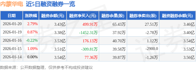 内蒙华电融资融券信息显示,融资方面,当日融资买入4456.56万元,融资偿还3956.65万元,融资净买入499.91万元。融券方面,融券卖出28.17万股,融券偿还6600.0股,融券余量65.43万股,融券余额313.41万元。融资融券余额3.46亿元。