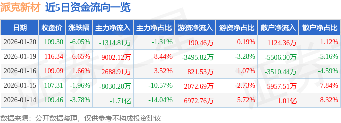 证券之星消息,截至2026年1月20日收盘,派克新材(605123)报收于109.3元,下跌6.05%,换手率7.43%,成交量9.0万手,成交额10.06亿元。