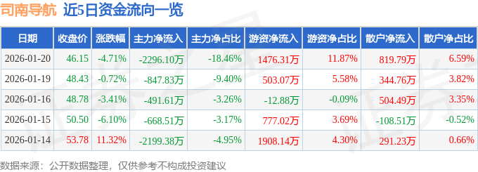 证券之星消息,截至2026年1月20日收盘,司南导航(688592)报收于46.15元,下跌4.71%,换手率6.9%,成交量2.66万手,成交额1.24亿元。