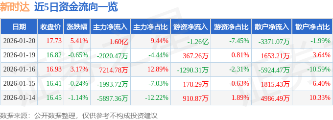 证券之星消息,截至2026年1月20日收盘,新时达(002527)报收于17.73元,上涨5.41%,换手率17.67%,成交量93.51万手,成交额16.93亿元。