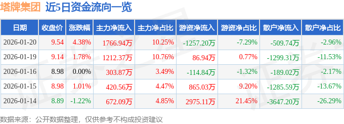 证券之星消息,截至2026年1月20日收盘,塔牌集团(002233)报收于9.54元,上涨4.38%,换手率1.55%,成交量18.43万手,成交额1.72亿元。