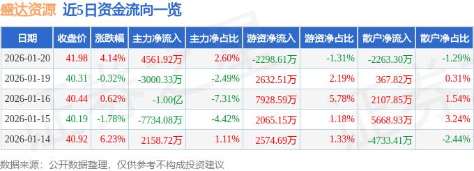 证券之星消息,截至2026年1月20日收盘,盛达资源(000603)报收于41.98元,上涨4.14%,换手率6.47%,成交量43.11万手,成交额17.54亿元。