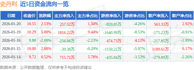 1月20日的资金流向数据方面,主力资金净流入257.52万元,占总成交额1.34%,游资资金净流出820.85万元,占总成交额4.26%,散户资金净流入563.33万元,占总成交额2.92%。