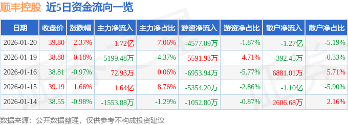 证券之星消息,截至2026年1月20日收盘,顺丰控股(002352)报收于39.8元,上涨2.37%,换手率1.29%,成交量61.51万手,成交额24.41亿元。