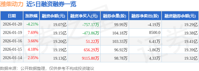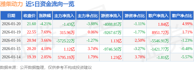 证券之星消息,截至2026年1月20日收盘,潍柴动力(000338)报收于21.6元,下跌4.21%,换手率3.39%,成交量169.6万手,成交额36.81亿元。
