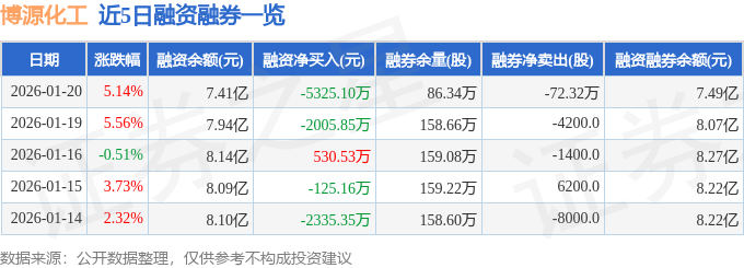 博源化工融资融券信息显示,融资方面,当日融资买入5336.1万元,融资偿还1.07亿元,融资净偿还5325.1万元。融券方面,融券卖出2.3万股,融券偿还74.62万股,融券余量86.34万股,融券余额741.66万元。融资融券余额7.49亿元。