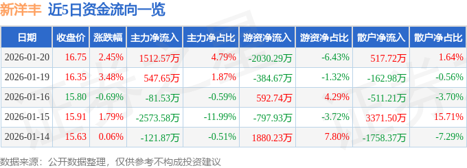证券之星消息,截至2026年1月20日收盘,新洋丰(000902)报收于16.75元,上涨2.45%,换手率1.67%,成交量19.04万手,成交额3.16亿元。