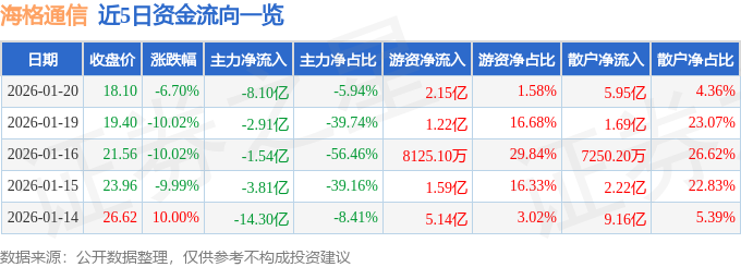 证券之星消息,截至2026年1月20日收盘,海格通信(002465)报收于18.1元,下跌6.7%,换手率30.2%,成交量748.37万手,成交额136.41亿元。