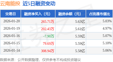 证券之星消息,1月20日,云南能投(002053)融资买入1248.03万元,融资偿还982.32万元,融资净买入265.71万元,融资余额5.63亿元。