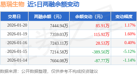 证券之星消息,1月20日,易瑞生物(300942)融资买入493.48万元,融资偿还407.57万元,融资净买入85.91万元,融资余额7444.94万元,近3个交易日已连续净买入累计230.36万元。