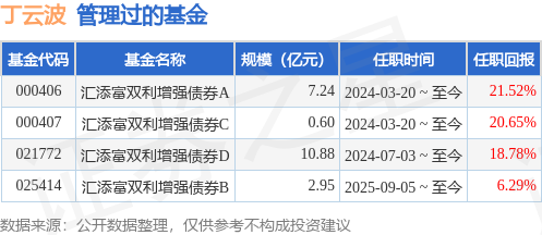 证券之星消息,2026年1月21日,汇添富稳健收益混合(009736)发布公告,增聘丁云波为基金经理,任职日期自2026年1月21日起,邵佳民不再担任该基金基金经理,离任日期为2026年1月21日,变更后汇添富稳健收益混合(009736)的基金经理为徐一恒,丁云波,李安。截止2026年1月20日,汇添富稳健收益混合净值为1.0737,较上一日上涨0.37%,近一年上涨11.77%。
