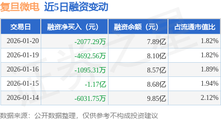 证券之星消息,1月20日,复旦微电(688385)融资买入1.14亿元,融资偿还1.35亿元,融资净卖出2077.29万元,融资余额7.89亿元,近20个交易日中有11个交易日出现融资净买入。