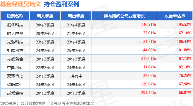 吴培文管理的汇丰晋信珠三角区域发展混合基金在20年3季度买入振华科技,在持有1年又1个季度后在21年4季度卖出。持有期间的估算收益率为195.52%,持有期间振华科技在2020年到2021年的年报归属净利润增幅达146.21%。