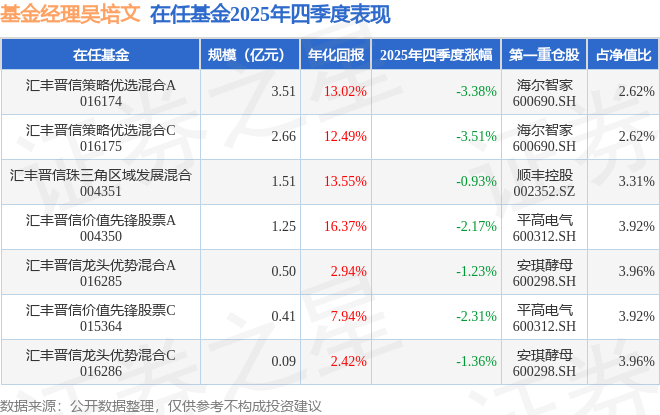 证券之星消息,截止2025年四季度末,基金经理吴培文旗下共管理7只基金,本季度表现最佳的为汇丰晋信珠三角区域发展混合(004351),季度净值跌0.93%。